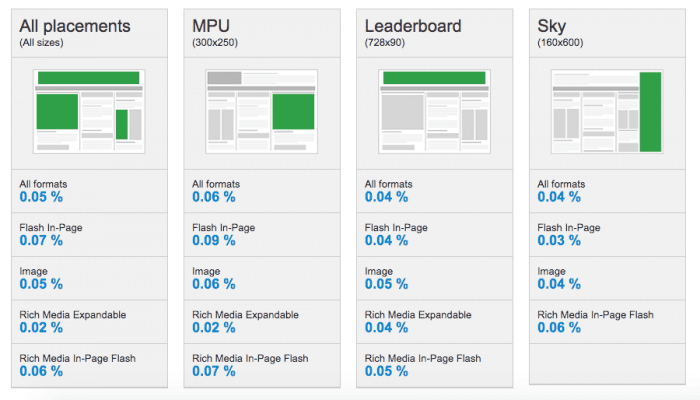 The above might even be painting a slightly positive picture of the performance of Google Display Ads, when you consider Google’s own previously public data which shows a CTR of just 0.05% for all display formats (that’s just 5 clicks for every 1,000 impressions). Sadly this data was last updated in 2015 since which Google have stopped reporting on aggregate CTRs (see below for reference):