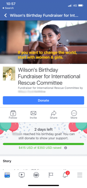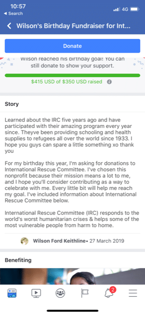 - Fundraisers – Fundraisers allow you to enable your supporters to reach out to their friends, family and whoever else they may be friends with on Facebook to raise money for your cause. This is where things get really exciting!
