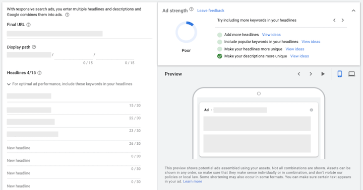 Try to keep the headlines and descriptions unique to have better insights on which headlines and descriptions are working best. On the headlines, while you can add up to 15 headlines (keep that brain working, yo!), you can start by adding at least five unique headlines and add more later. The more headlines you add, however, the better the performance could get.