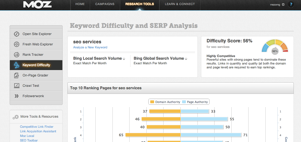 The Moz Keyword Difficulty Tool helps you to identify keywords your business can and cannot rank for. Don’t expect your business to rank on the first page of Google for every keyword you wish to target, some will be impossible without spending $100,000s in search engine optimisation and paid search.