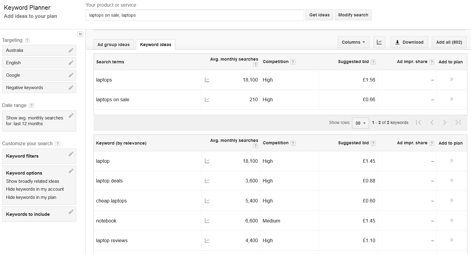 In the image above you can see an example of a generic and long-tail keyword and their respective search volume per month within Australia. You’ll also notice that in the search bar we’ve entered just two keywords, which Keyword Planner has reported on followed by a secondary box below where Keyword Planner has found lots of other related keywords for us to examine. These related keywords can be an absolute goldmine of information when planning your search campaigns.